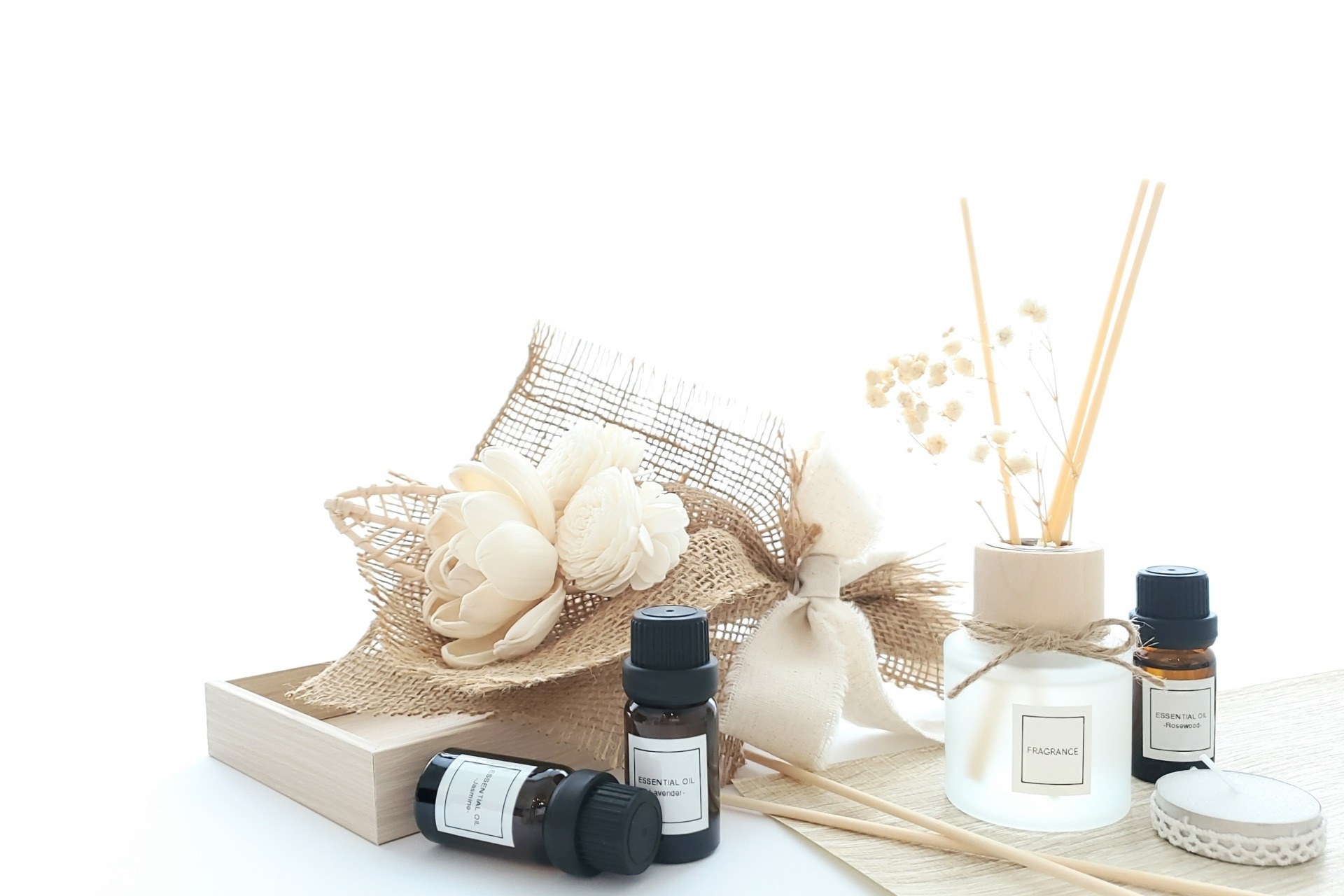 フレグランスオイルは、ドライフラワーやハーブに数滴垂らして香りを楽しむ方法や、リードディフューザーやアロマキャンドルの材料として使用する方法があります。空間を香らせることで、部屋の雰囲気を変えたり、心を落ち着かせたりする効果が期待できます。
